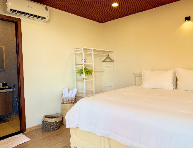 Ở đây, không có tiếng xe cộ, không có deadline dồn dập, chỉ có một chiếc giường trắng tinh mềm mại, ánh nắng xuyên qua ô cửa tròn, và mùi thơm dịu nhẹ của gỗ và cây xanh len lỏi từng hơi thở.